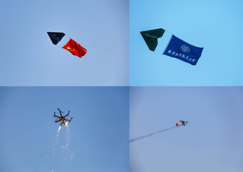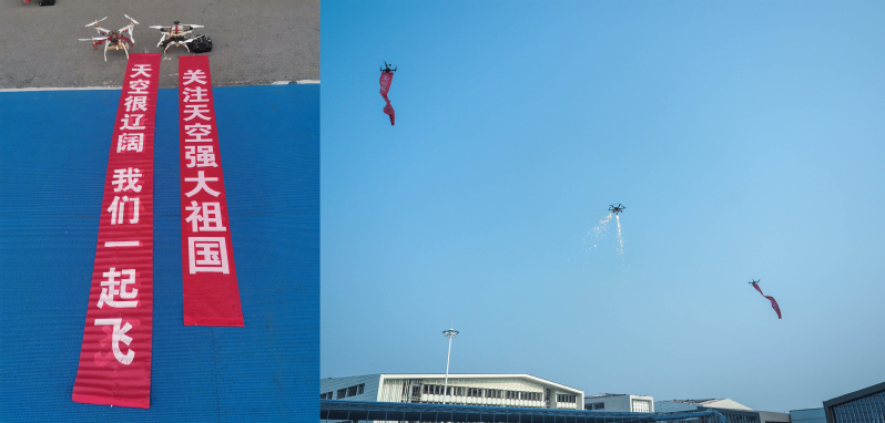 随后,由南航学生吴俊奇研制的“御精灵”多旋翼无人机携带条幅“关注天空强大祖国”与“天空很辽阔、我们一起飞”的美好祝福翱翔起飞,与万里长空交相辉映。