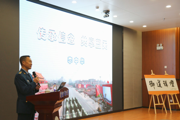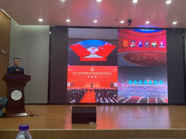 面对台下的学弟学妹,作为学长的李中华表示,是母校的教育培养了他献身共和国国防事业的初心。李中华介绍了自己参与新中国成立70周年“最美奋斗者”表彰大会、人民大会堂国庆招待会、阅兵及群众联欢等国庆系列活动的所见所感。他认为,这一系列气势恢宏、大度雍容、纲维有序、礼乐交融的国之盛典,既展现了当今中国的综合实力,也传达了中华民族自信而喜悦的风貌。