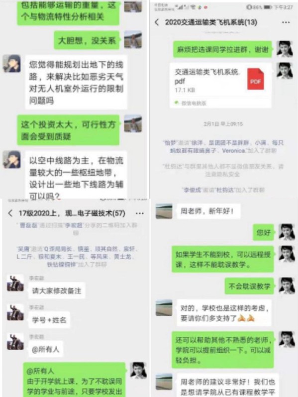 民航工程系周洁敏老师为了不耽误交通运输工程(民航电子电气工程)专业大三、大四学生新学期的学习,从2020年2月1日(正月初八)开始,主动联系新学期选修其课程的同学,分别建立多个课程学习群,如联系大三学生建立了《现代电力电子磁技术》、《飞机电气系统总体设计》等课程学习群,联系大四学生建立了《交通运输类飞机系统》课程学习群。周老师正准备把相关课件发到每个课程学习群里,让同学们能够在家里自学。此外,周老师积极主动联系教务处相关领导,希望利用学校的雨课堂等线上教学资源,为下学期可能进行线上授课做积极准备。时刻不忘教师的本职工作。