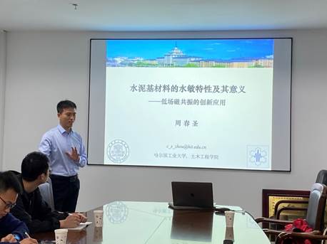 周春圣教授详细讲解了该方向的文献研读、实验测试、理论分析和数值模拟,让在场师生对水泥基材料的水敏性有了更深入的了解。报告会上,周春圣教授详细地为在场师生答疑解惑,就水泥混凝土类材料的水化中止技术、孔结构测试技术以及孔结构的表征方法进行了深入的研讨,激发了同学们对低场磁共振技术在水泥基材料中应用的研究兴趣,为深刻认识水泥混凝土类材料微结构的提供了新的视角。