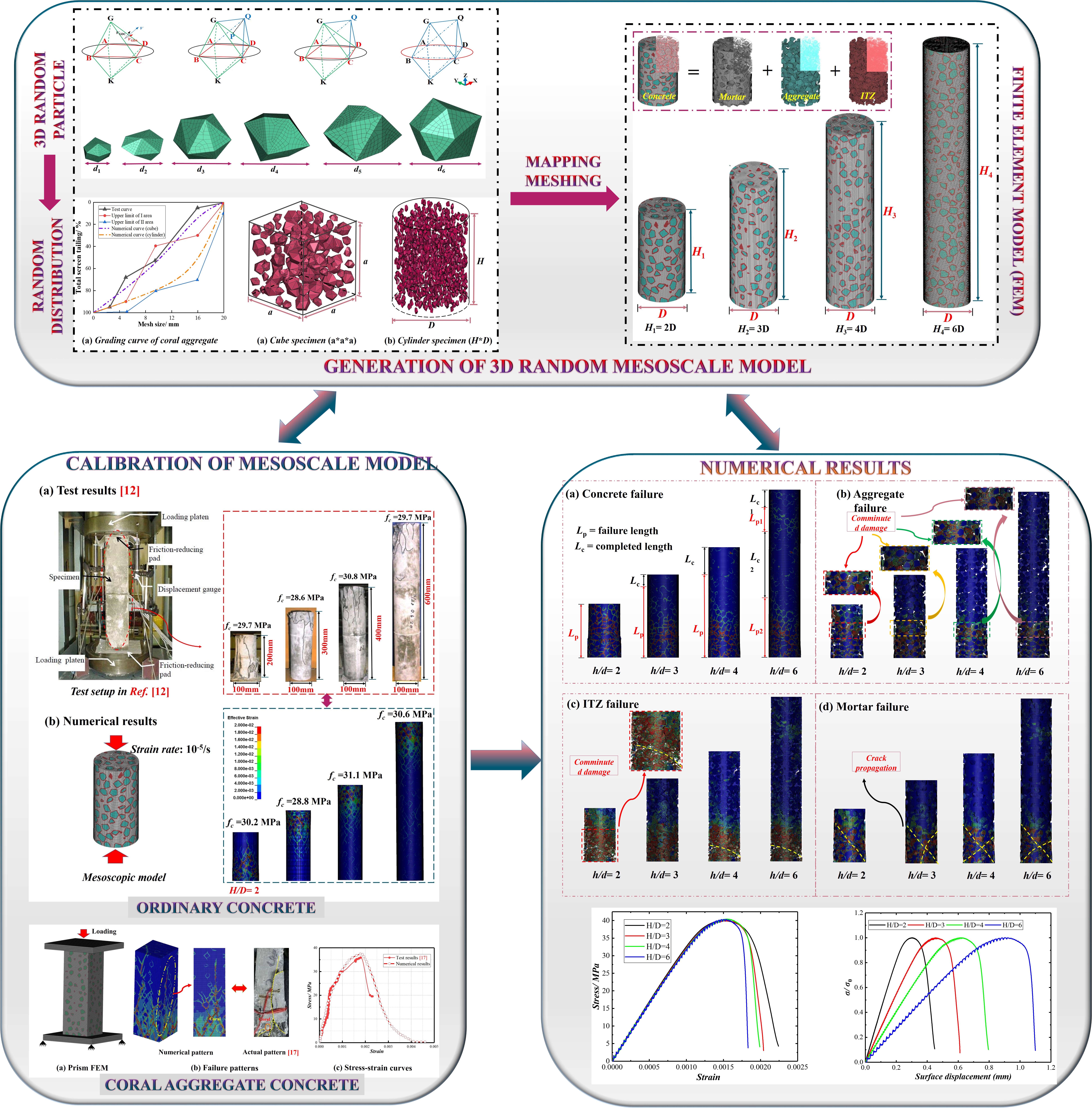 我国南海岛礁远离祖国大陆,砂石与淡水资源匮乏,为了降低造价、保证工期和解决原材料来源等问题,在不破坏岛礁生态环境的前提下,就地取材,采用珊瑚礁()作粗()骨料,海水拌合和养护的方法制备的珊瑚混凝土,已逐步应用于港口、堤坝、机场与道路等岛礁工程建设中,具有重要的理论意义和工程应用价值。在细观层次上,混凝土通常被假定为一种由粗骨料、砂浆及二者之间的界面过渡区域组成的复合材料,细观各组分的力学性质直接或间接地决定了混凝土材料的宏观力学性质和破坏模式,深入研究混凝土细观结构特点及其力学性能,建立细观结构和宏观力学性能之间的关系,是混凝土力学性质的重要研究内容之一。本项研究提出了一种可以有效表征珊瑚混凝土空间随机特性的三维随机细观模型。基于所建立的三维随机细观模型及已有珊瑚混凝土的力学性能试验参数,从细观层次研究了试件高径比对珊瑚混凝土的静态抗压行为的影响规律,并通过对珊瑚混凝土的开裂过程和破坏形态进行数值分析,得到了珊瑚混凝土的破坏模式及失效机理。该研究工作旨在深入研究珊瑚混凝土材料的力学行为和损伤破坏机理,同时为不同荷载作用下珊瑚混凝土或其他混凝土类材料的力学性能分析研究提供新思路。