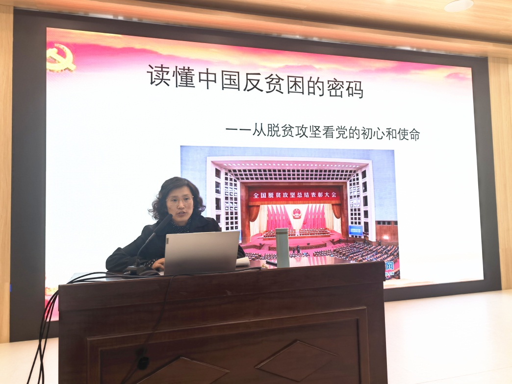 开班动员会后,bob体育 邀请马克思主义bob体育 副教授薛葵作《读懂中国反贫困的密码——从脱贫攻坚看党的初心和使命》专题党课宣讲。从四个方面深度阐述了中国共产党的初心和使命,以及在脱贫工作中所取得的巨大成就:一是中国反贫困取得的历史性功绩;二是中国科学合理的贫困标准制定;三是“不忘初心、牢记使命”的脱贫攻坚战成功秘诀;四是中国共产党坚持的人民至上,共同富裕的基本理念。薛老师动情讲述“李保国”、“张桂梅”、“黄文秀”等优秀脱贫攻坚战代表人物的光荣事迹,展示了中国共产党脱贫攻坚的决心与行动。薛葵老师希望各位同学能从这节党课中学有所得,从中国的脱贫攻坚路理解中国共产党的初心和使命,同时也能深入思考自己的入党初心。