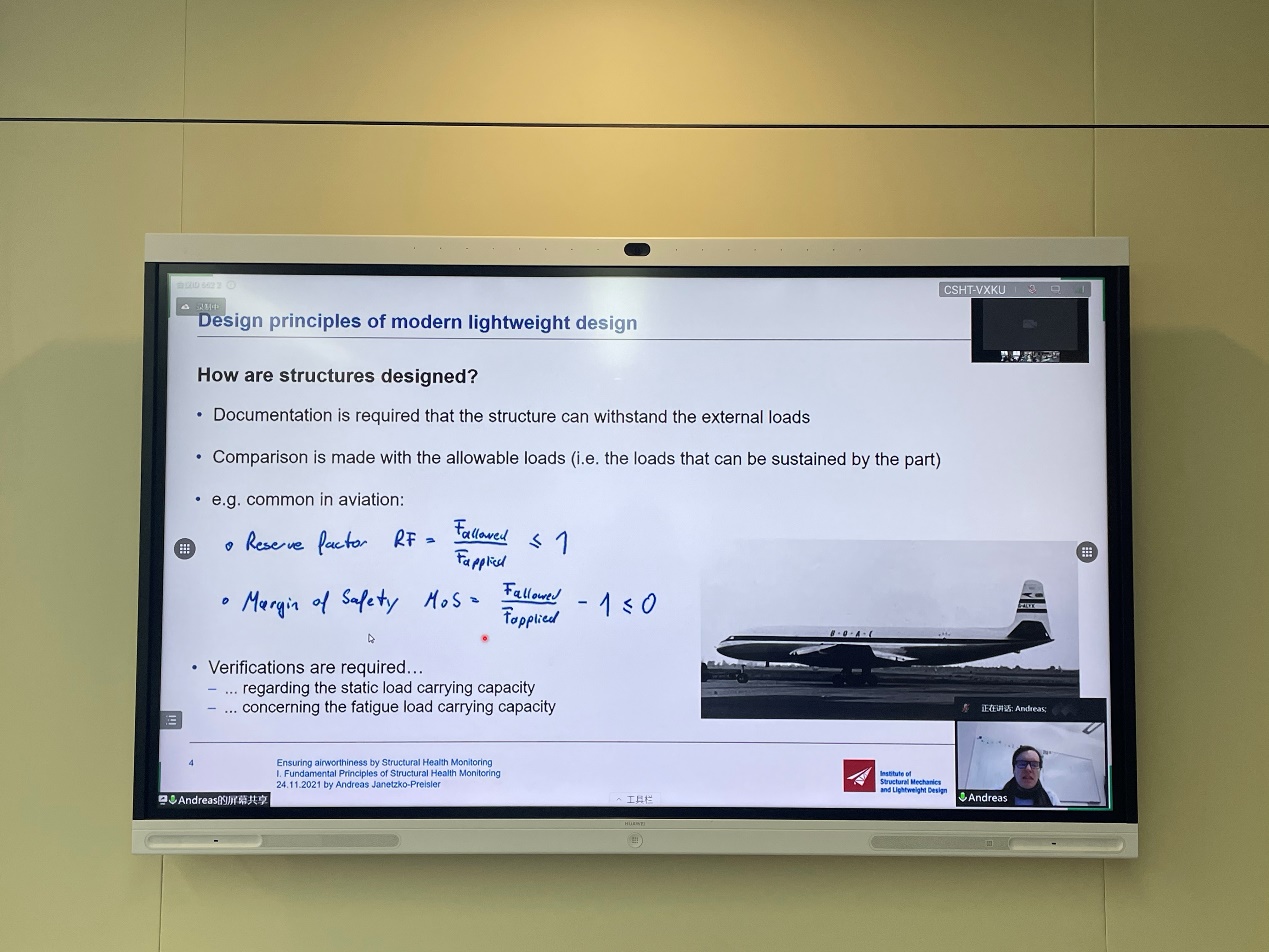 讲座开始前,黄天翔老师首先对Andreas Janetzko-Preisler及其讲座内容进行了简单的介绍。Preisler博士任职亚琛工业大学,主要负责结构健康监测的研究工作。Preisler博士的讲座题目为《Ensuring airworthiness by Structural Health Monitoring (Series 1)》。本次讲座以轻量化设计的发展历程为背景,主要介绍了结构健康监测的发展需求、对应任务及其基本原理。