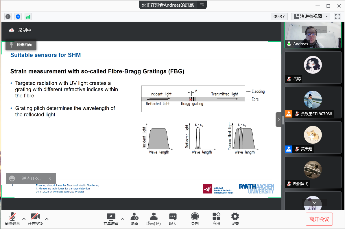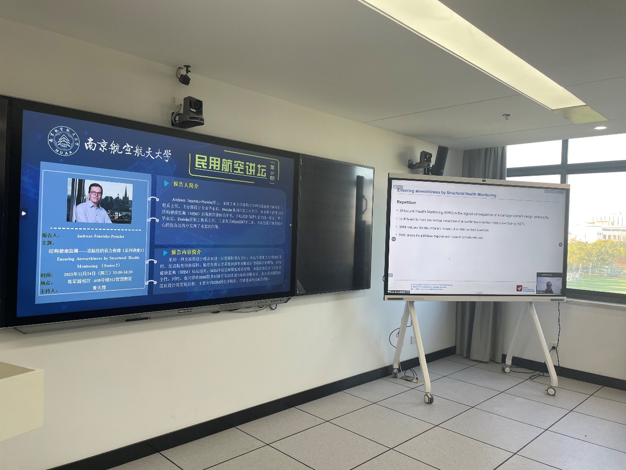 11月24日下午,“民用航空讲坛”第十九期讲座成功举行,讲座采用了线上线下相结合的形式,线下会场设置在将军路校区A08号楼312智慧教室。本次讲座由bob体育官网 黄天翔老师主持。德国亚琛工业大学结构力学和轻量化设计研究所(SLA)工程系主任Andreas Janetzko-Preisler受邀为师生带来了一场围绕结构健康监测展开的线上讲座。