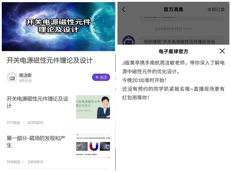 此前,周洁敏教授还在电子星球eestar等平台开设了《开关电源磁性元件理论与设计》公益课程,通过开设这些课程,让更多相关研究人员有途径对相关知识进行系统的学习,从而在实际工作中提升产品设计的能力,缩短开发周期,提升效率。