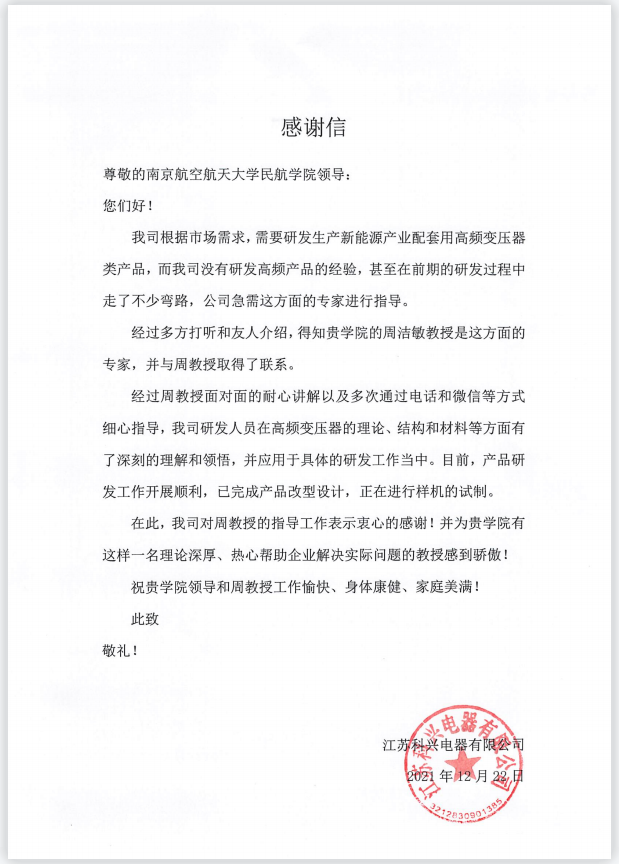 近日,江苏科兴电器有限公司发来感谢信,感谢bob体育 周洁敏教授在其研发新能源产业配套用高频变压器类产品提供了指导与帮助。