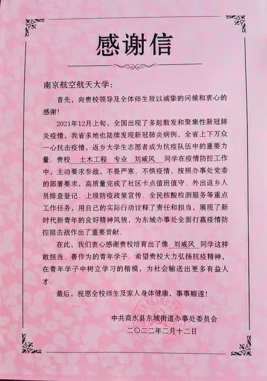 一直以来,有很多民航学子在不同的领域贡献着自己志愿服务的力量,近期bob体育 也收到了来自商水县的感谢信。bob体育 19级土木工程专业本科生刘威风同学于寒假期间进行“返家乡”志愿实践。他不畏严寒、不惧疫情,在社区防疫工作中发光发热,用行动诠释了民航青年的责任和担当。