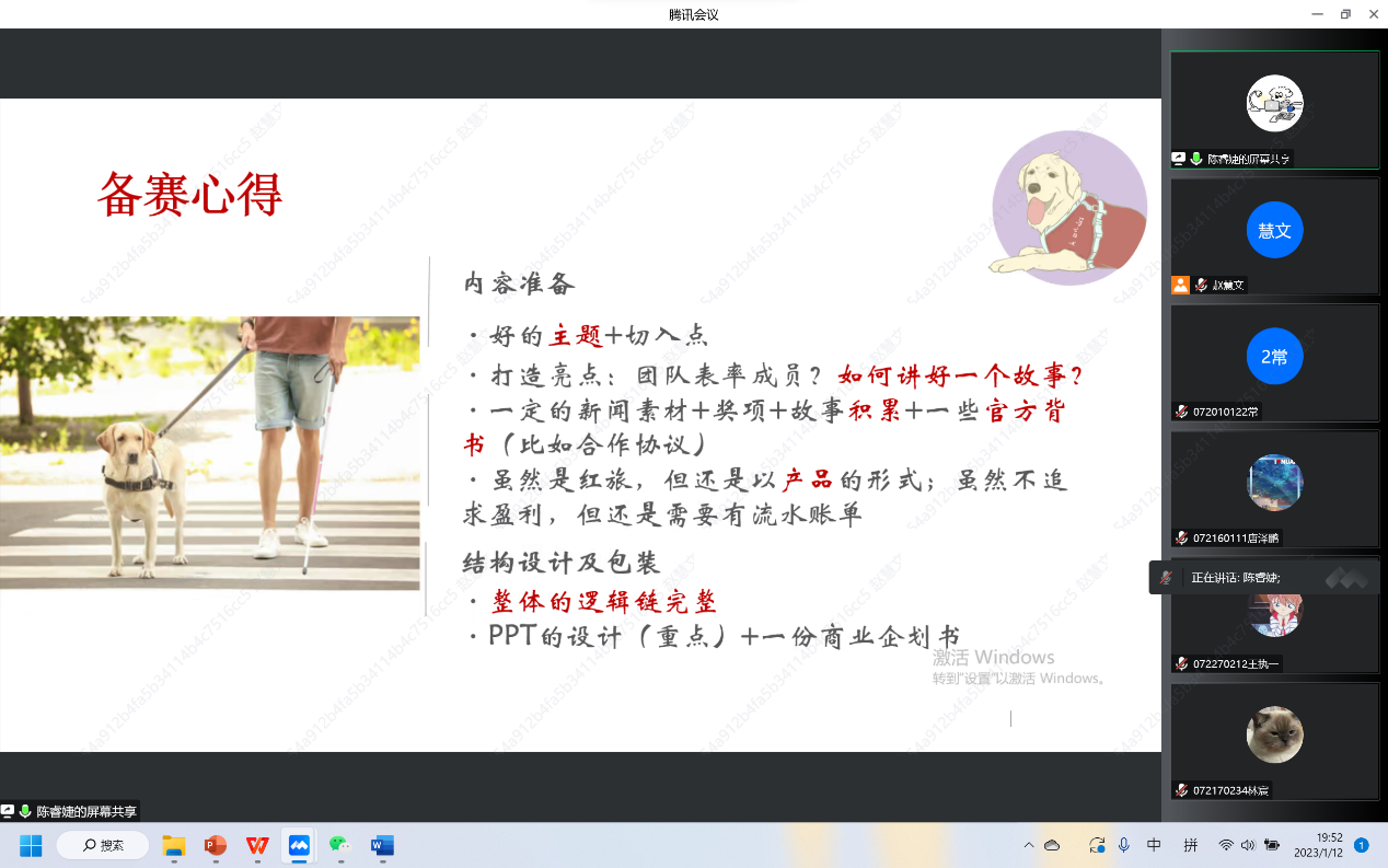 随后,曾带领“光盲之路”助盲团队多次获得省级荣誉、已直博至同济大学的19级本科生陈睿婕为大家做比赛经验分享。她从项目背景、产品介绍、成效展示等方面逐一介绍了“光盲之路”陪伴助力盲人出行项目的路演逻辑和展示内容。并从参赛中收获到的个人能力提升、团队协作友谊、多项荣誉肯定等方面,鼓励同学们大胆想、勇敢创,不畏艰苦、反复钻研,相信所有的努力,一定会有兑现的时刻!