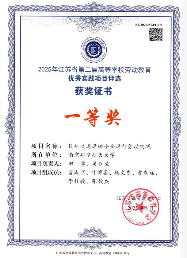 近日,江苏省第二届高等学校劳动教育优秀实践项目评选结果揭晓,bob体育官网 “民航交通运输安全运行劳动实践”项目荣获一等奖。