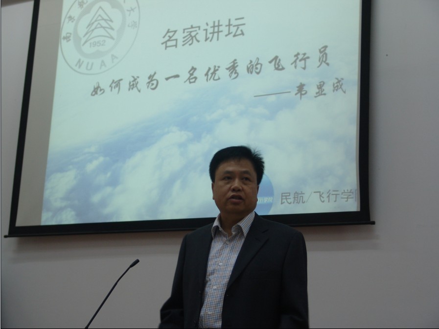 当天下午6点20分,韦总在刘建成副书记的陪同下进入了演讲会堂,所有学员向韦总表达了热烈欢迎与深深敬意,掌声振聋发聩,场面壮观。6点30分,演讲开始。首先,主持人为同学做了韦总的简单介绍,韦显成,从事近30年的飞行教学工作,安全飞行25061小时,飞越了世界5大洲,获民航总局颁发的金质安全奖,特级安全奖,2002被民航总局授予最高等级的安全飞行荣誉——“功勋飞行员”。在场学员只能通过不断的掌声和惊叹来表达对韦总光辉业绩的敬佩之情。接着由韦显成给大家演讲。演讲的重点有两个,一是学习,而是责任。关于学习,韦显成强调了我们飞行学员在校期间应掌握过硬的专业知识、飞行技能以及英语,同时韦总还献身说法用自己当年的学习经历来鼓舞学员们。关于责任,韦显成通过举国内外几起严重的空难来为学员敲响警钟,飞行员手握国家资产、上百条生命,强大的责任心实属必须,在场学员必须铭记。在韦显成声情并茂的演讲中,学员们如痴如醉,忘记时间。一位花甲老人为我们进行长达2小时的演讲没有休息,这份精神让我们可叹可敬。
