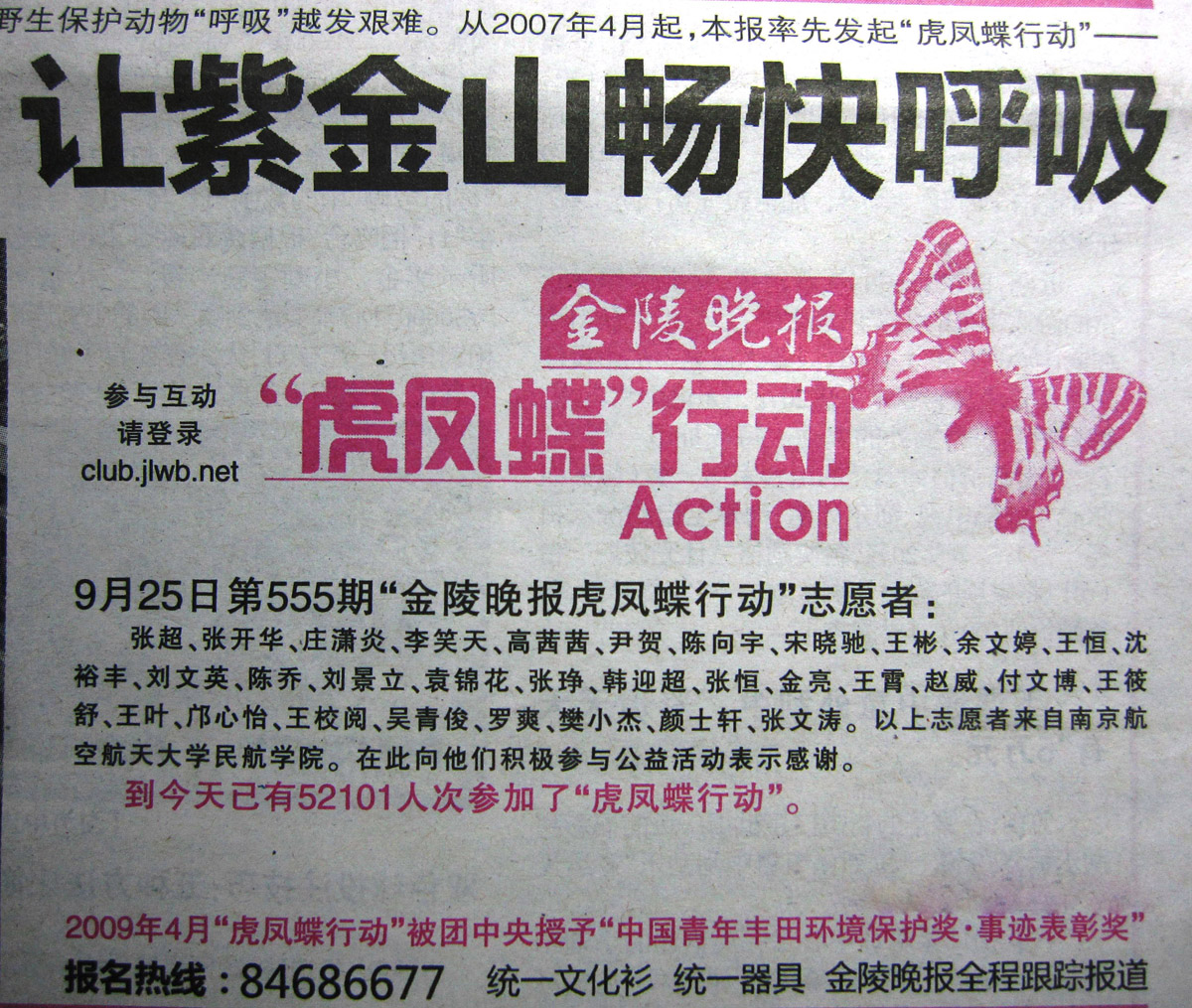 bob体育官网 积极参加《金陵晚报》“虎凤蝶”环保活动
