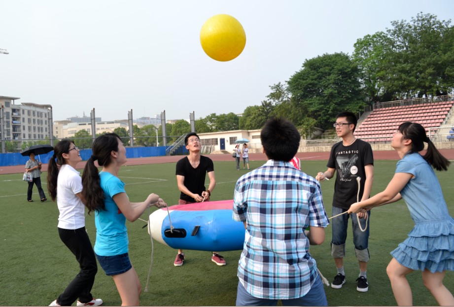 毛毛虫退场之后,同学们玩起了众星捧月。众星捧月,顾名思义,即是一群人共同托举着一个气垫,在气垫上颠球。这个项目考验的是参赛队员对于力度的掌握和队员间的协调合作能力。在这个项目中,bob体育官网 的同学充分发挥了团体协作的优势,齐心协力,节奏一直,一举以83个的成绩夺魁。