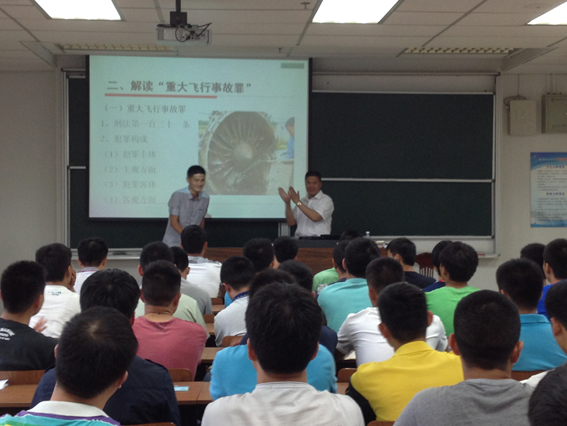 首先,刘总飞行师为师生播放了关于8.24空难的开庭情况的视频,并带领大家简单回顾了伊春8.24空难的相关背景;其次,刘总飞行师结合伊春8.24空难,给大家解读了“重大飞行事故罪”,包括法律条款和犯罪构成等知识点。同时,还和现场飞行员同学热情互动,请一些同学回答关于航路图和空难原因分析等问题;然后,刘总飞行师通过视频短片,完整的带领大家回顾了伊春8.24飞行事故发生的整个过程,并就事故原因向在场的同学进行提问,同学们积极思考,回答也得到了刘总飞行师的肯定;最后,刘总飞行师通过几段事故实例,总结了5条安全启示,分别为恶劣天气对飞行安全的影响、五大危险的飞行心理态度(包括侥幸、冲动、逞能、反权威、顺从)、正视管道效应和机组资源管理等。