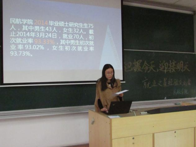 活动一开始,主持人向大家通报了2012级研究生就业的整体情况。毕业生选择的就业单位范围广,民航企业和非民航企业平分秋色,航空公司和研究所是最热门单位。在地域选择方面,以北上广、青岛、深圳、厦门居多。总体看来,本届毕业生的就业情况还是比较顺利的。