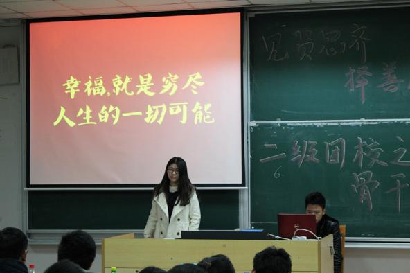 大四学生罗浩巍首先登上讲台,讲述了他大学四年一路走来的点点滴滴。在他的款款诉说中,学员们看到他在学生工作中的任劳任怨,在志愿服务中的永不言弃,在大学生活中的他不曾止步。他勉励大家要逼自己站在更高的位置,充分激发自己的潜能。