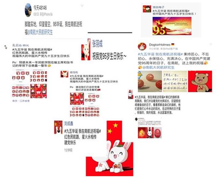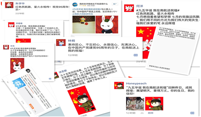 建党节当天,2015级研究生党支部的所有党员统一换上了象征“红色记忆”的头像,缅怀先烈的同时融入了时尚元素,并且通过微信、微博这样的新媒体平台,号召大家从自身的角度出发,讲真话、抒真情,讲述自己与党的故事,表达对建党95周年的衷心祝愿。活动在年级里掀起一阵送祝福热潮,同时也为其他学生做了很好的表率作用。