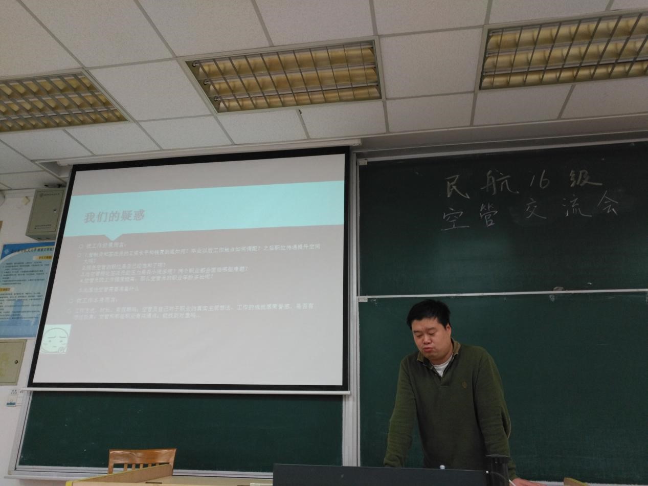 10月26日下午2点在6302教室,bob体育官网 2016级举行了“从‘虹桥机场事件’说开去”空管专业交流会,邀请到空管系副主任孙樊荣、bob体育官网 2015届毕业生、江苏空管分局管制员王挺到现场与学生交流。
