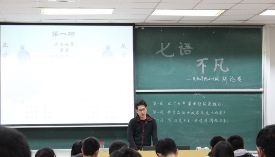 本次辩题可称新时期的热门话题,辩手们顺着辩题背景的介绍展开精彩的辩论。第一场的辩题是“这个世界需不需要超级英雄”,两支队伍由英雄带给我们的激励为开端展开辩论,由耶稣爱和华谈到了释迦摩尼,再到平凡中的人带给我们的激励与感动,同学们更新了对超级英雄的定义。第二场辩论可称全场最为胶着的比拼,正反双方围绕“是想要大城床还是小城房”这一与我们的未来息息相关的话题,为我们展示了一场激烈而有深度的辩论,阐述了不同价值观人群的想法与追求。第三场辩论主题从我们日常生活攫取而来,即为“你认为穷游是不是一件值得骄傲的事”。双方举例新闻事件,反方咬住穷游安全问题的关键,正方又时时以穷游本身的乐趣与意义攻击反方,双方情绪一度激动不已……