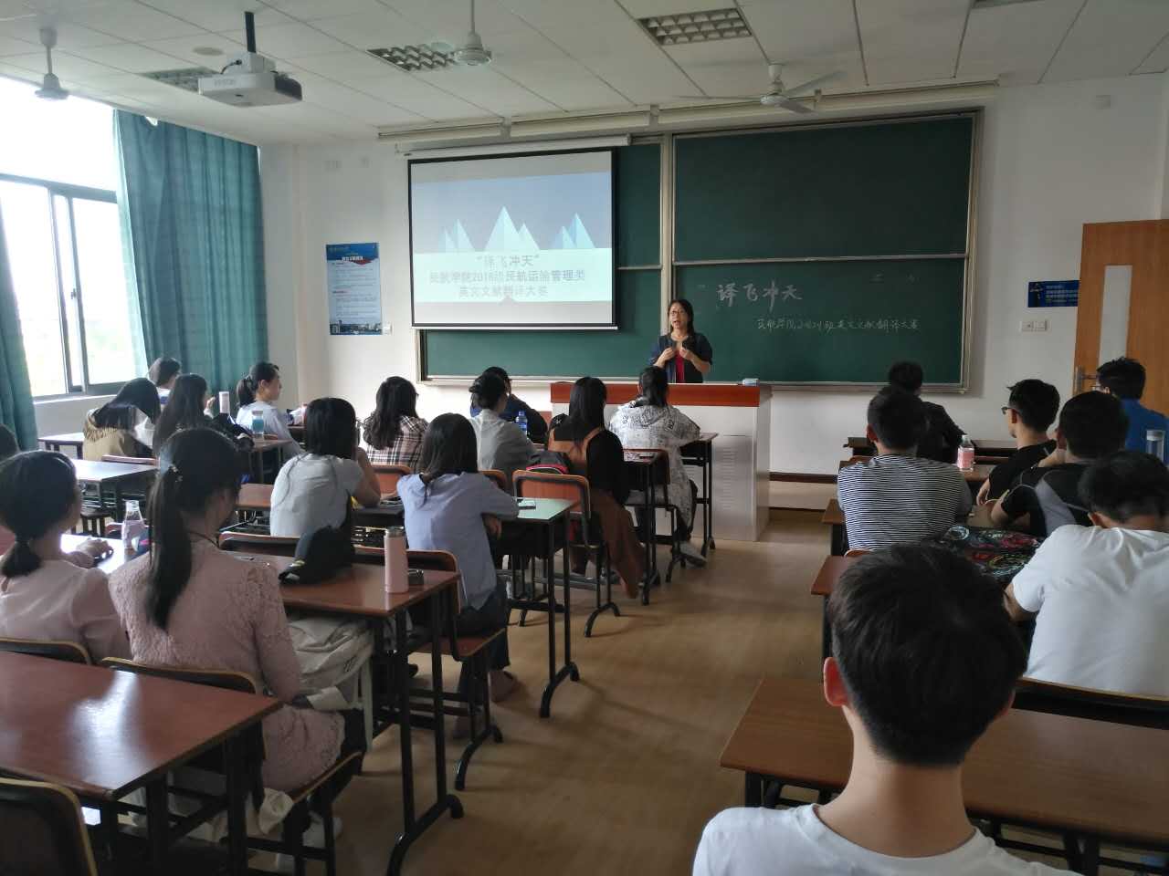 宣讲会从班主任与同学们亲切的交谈开始。首先,班主任白杨老师分析了在民航运输管理专业的学习和运用中,具有翻译英文文献能力十分重要。接着介绍了文献来源和梗概,以及比赛后期评分标准等。听完老师的介绍,同学们对于文献翻译比赛有了更近一步的理解和认识。
