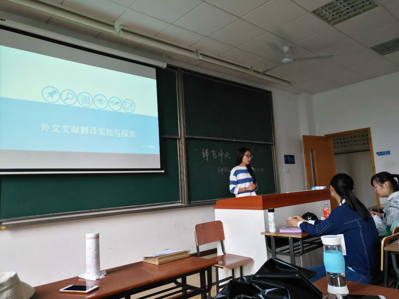 接下来在“老司机带你飞” 英文文献翻译教学小课堂中,博士生学姐冯杰向同学们授教文献翻译方法。学姐从亲身经历入手,讲述文献的检索、文献的筛选、翻译的科学性、技术性等具体要求、翻译的具体步骤如泛读、信息重组等。在文献翻译方面还是“零概念零尝试”的同学们受益匪浅。除此之外,学姐还向大家分享了图书馆电子资源,推荐了实用的翻译助手软件等,建议我们以此次比赛为出发点,阅读并尝试翻译更多的英文文献资料,不断增强自身翻译能力。