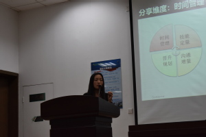 首先,热情洋溢的周峰老师就给同学们留下了深刻的印象。周老师就撕掉自己所有的标签,告诉我们除去一切标签,自己是一个热情洋溢的演讲者,通过自己几次任职经历告诉在座的准毕业生们:在职场中,要学会表达。其次,陈韵竹老师给我们分享了自己寻找初心,寻找人生事业的经历。为了找到自己人生想做的职业,她同期有包括联合国总部在内的8份实习经历,其中有两份实习是全职。go above and beyond,她认为在追寻梦想的过程中,必须要不断的超越自我,给自己更高的定位。她有一句话令人印象深刻:如果一个员工把公司当做是自己的公司,最终他会非常优秀。意在提醒毕业生,在求职时要追寻梦想,在工作时要具有主人翁意识。上海交通大学优秀校友李娜则给我们分享了管理时间的经验。量化、效率是时间管理的关键词。日事日毕,是职场人效率的体现,而长期任务又需要按照周计量与月计量的方式进行分割量化,让长期任务变得不再遥不可及。