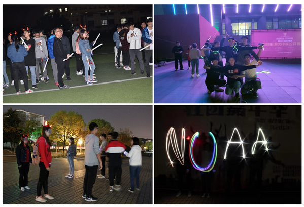 随着指令的发出,活动正式拉开了帷幕。同学们以小组的形式前往活动点,自由选择完成任务的路线。“俺最爱摆拍”是协调能力和运气的比拼,每组同学都要互相支撑完成高难度的动作并维持5秒钟;“夜光找找看”环节需要队员用精准的眼力寻找到散落的荧光棒;“傻傻分不清”中队员们团结一致、精诚合作,引导被蒙住眼睛的同学找到混入其中的工作人员;紧张刺激的“放胆来答题”环节只有集中十二分精神才能抢到答题权;“终极大PK”充分发挥了同学们天马行空的想象力和创造力,用荧光棒制作出不同的时尚造型,拍照后在签到板上设计并绘出队名和队徽。缤纷的荧光划过黑夜,像流动的霓虹灯一样在整个校园中闪烁,同学们的欢笑声也充满了校园的每个角落。