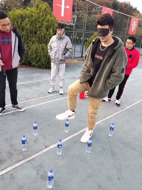 第一个团队游戏是“齐心协力”,其中一个组员的左脚与另一组员的右脚绑在一起,各小组之间竞速走赛道,耗时最短组获胜。“齐心协力”考验了组员之间的配合能力,同时也加深了团队间的默契程度。在“地雷阵”游戏中,按照游戏规则一个组员眼睛被蒙住,由队友来指挥他顺利走出铺满“地雷”的雷区,以碰倒瓶子数的最少的小组获胜。