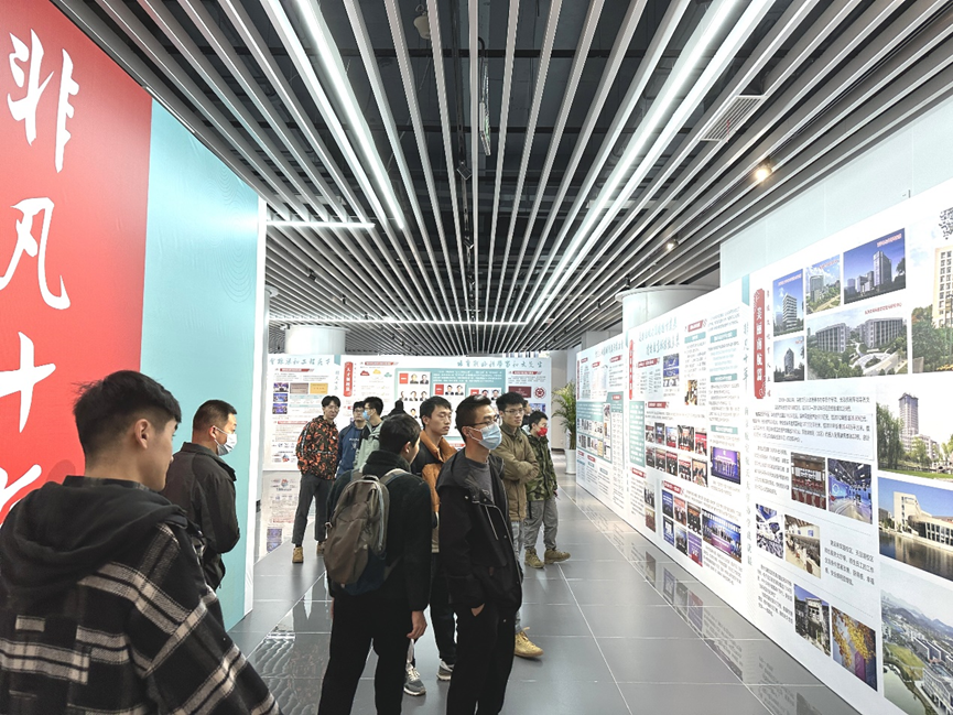 南航“非凡十年”办学成就展由7个篇章组成,分别是十年大事记、党建引领篇、人才培养篇、人才强校篇、学术创新篇、开放办学篇和美丽南航篇。伴随着讲解员的一一介绍,同学们的目光横跨南航“非凡十年”,纵览南航70年办学历史上的四次重大跨越,深刻领会我校十年来“为党育英才,为国铸重器”的标志性成果。