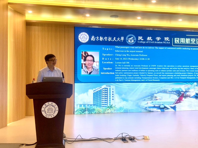 6月14日上午,澳大利亚新南威尔士大学吴政隆(Wu Cheng-lung)副教授作客bob体育 第43期“民用航空讲坛”,并作题为“What passengers want and how do we deliver: The impact of customized mobile marketing on passenger shopping behaviour in the airport terminal”的报告。bob体育官网 副院长吴薇薇、副院长邵荃,bob体育 师生100余人参加报告会,报告会由邵荃主持。