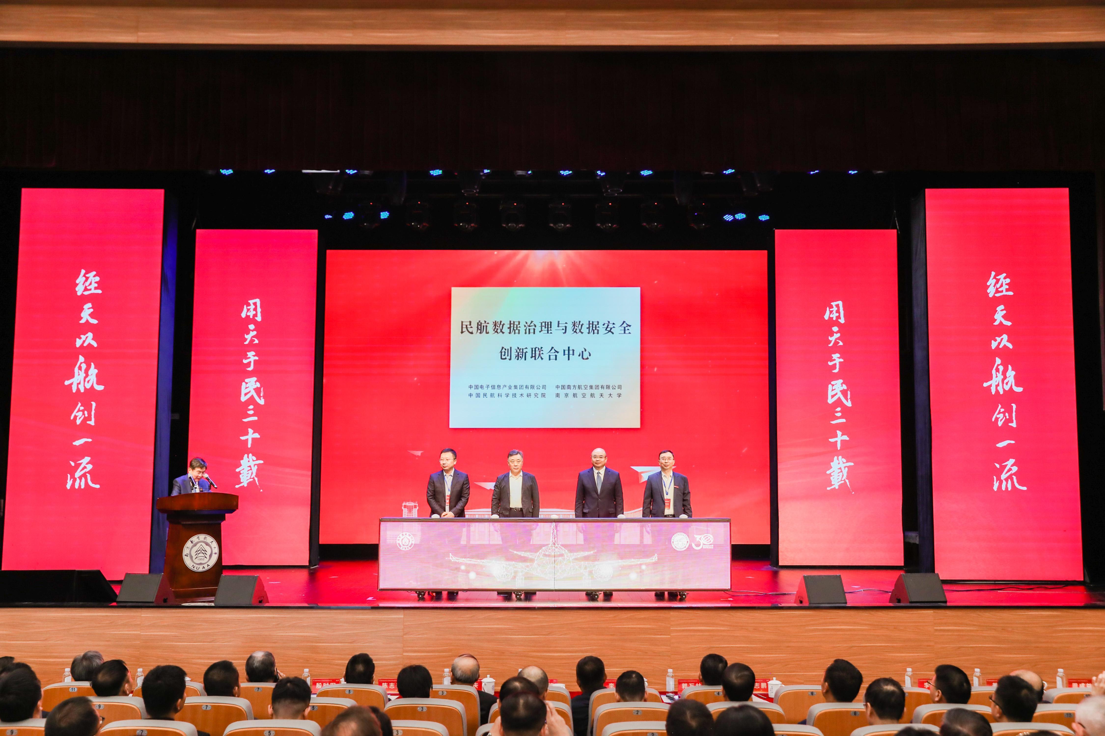 中国电子数据产业集团董事长陆志鹏、中国民航科学技术研究院院长李郁、中国南方航空集团有限公司总经理助理吴榕新、南京航空航天大学副校长姜斌共同为“民航数据治理与数据安全创新联合中心”签约并揭牌。联合中心将基于数据共享、资源共享、能力共建、业务共促、共同发展的建设原则,在民航领域内进一步落实国家大数据战略,全面深化产学研用融合,推动四方向一流研究院所、一流企业、一流大学迈进。