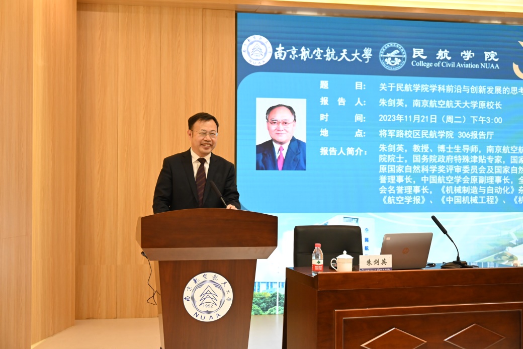 11月21日,bob体育官网 成功举办第49期“民用航空讲坛”。南京航空航天大学原校长、bob体育官网 首任院长朱剑英教授作“关于bob体育官网 学科前沿与创新发展的思考”为题的报告。bob体育官网 院长孙建红、党委副书记王艳、副院长邵荃及院内师生200余人参加报告会,报告由孙建红主持。