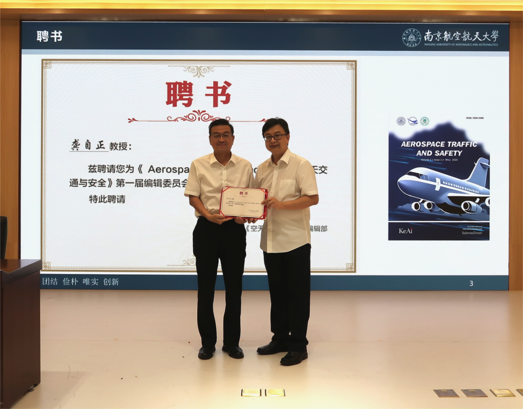 报告开始前,举行了我校英文期刊《 Aerospace Traffic and Safety 空天交通与安全》第一届编辑委员会委员聘任仪式。邵荃代表期刊编辑部为龚自正颁发聘任证书。