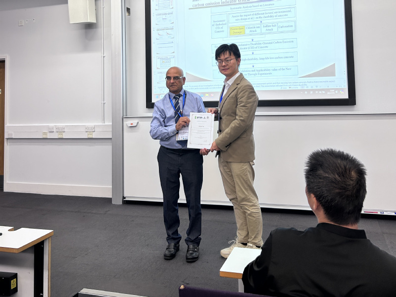 在学生学术交流竞赛环节,由bob体育官网 土木与机场工程系余红发教授、柳锦春教授和麻海燕副教授指导的4名博士生参加比赛,分别以水泥混凝土碳排放评价方法和低碳化设计、珊南海全瑚礁海水混凝土的碳足迹、城市高架桥混凝土结构的盐冻破坏与钢筋腐蚀、以及机场跑道泡沫混凝土阻拦材料的低碳化应用为题作会议报告。其中,范浩田同学表现突出,获得“最佳学生报告”三等奖,英国混凝土技术学会(ICT)前主席Raman教授为其颁奖。