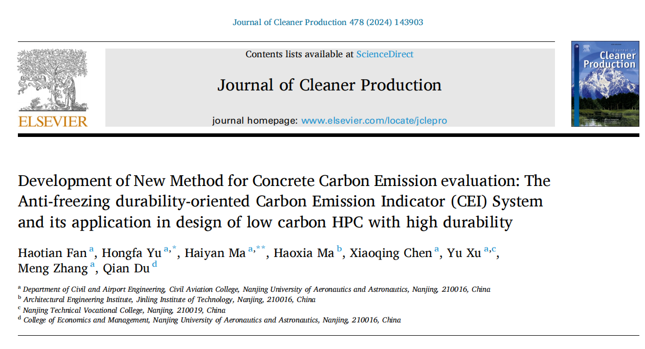 论文题目为“Development of New Method for Concrete Carbon Emission evaluation: The Anti-freezing durability-oriented Carbon Emission Indicator (CEI) System and its application in design of low carbon HPC with high durability”。本研究得到了国家自然科学基金、南京航空航天大学“引航计划”和南京航空航天大学博士生优秀毕业论文创新创优基金等项目的支持。