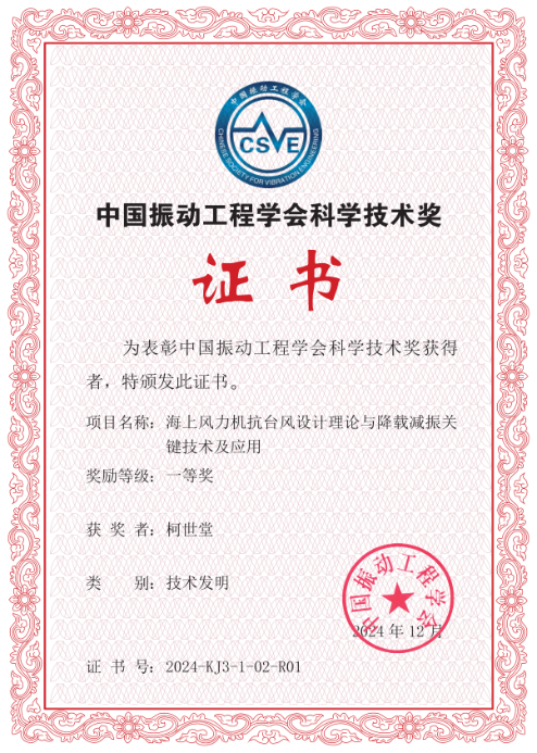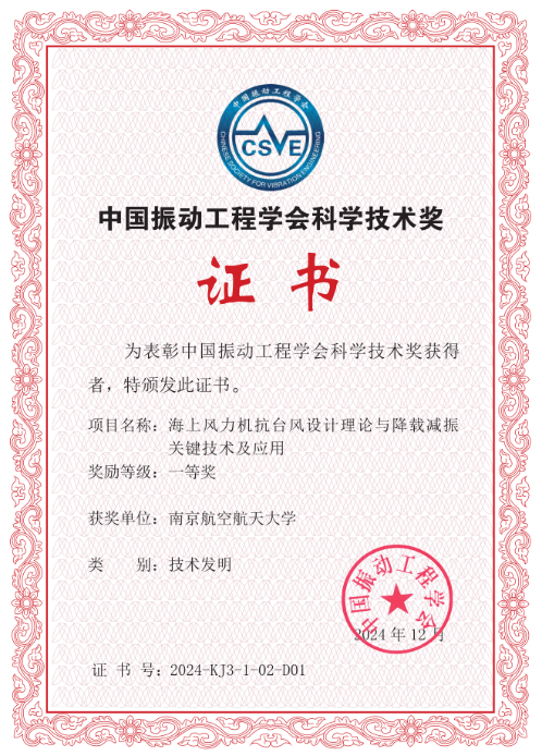 近日,中国振动工程学会公布了2024年中国振动工程学会科学技术奖获奖名单。由南京航空航天大学与香港理工大学、河海大学、中国能源建设集团广东省电力设计研究院有限公司合作申报的成果《海上风力机抗台风设计理论与降载减振关键技术及应用》获中国振动工程学会技术发明奖一等奖,这是我校在风工程与风能利用研究领域的又一项重要突破。bob体育官网 柯世堂教授为该奖项第一完成人,其他完成人包括香港理工大学朱松晔教授、河海大学许波峰副教授、广东院刘东华教授级高级工程师和我校航空bob体育 王珑副教授、bob体育官网 任贺贺副教授。