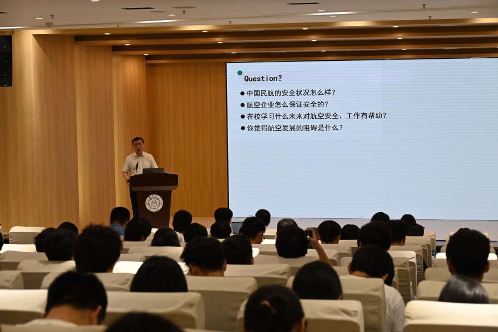 孟斌系统阐释了中国民航安全管理体系的演进路径与创新范式。他表示,民航安全管理历经摸索管理、经验管理、规章管理三个阶段,依托飞行数据监控系统、无损检测技术体系、5G移动通信网络等新一代数字化基础设施,构建起了全链条环节的安全管理体系。未来,民航安全管理将在人工智能应用、数据实时传输、安全预测等技术领域重点发力,全面提升基于信息系统的综合安全能力。他勉励民航青年学子,要筑牢民航专业知识根基,主动拥抱数字化浪潮,珍惜在校期间的理论积淀,积极参与校企联合实训等实践项目,将课堂所学与行业真实场景深度衔接,以敢为人先的探索精神,成为中国民航安全迈向科技驱动的中坚力量,在技术跃迁中勇担先行者的使命。