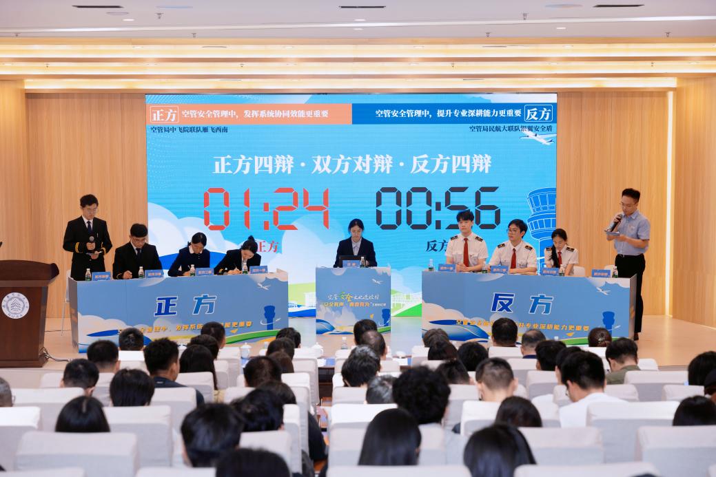 辩论赛在热烈的氛围中拉开帷幕。本次辩论赛聚焦“空管安全管理中,发挥系统协同效能与提升专业深耕能力,哪个更重要?”的辩题展开。双方辩手围绕辩题展开激烈而精彩的交锋,充分展现空管学子的专业素养和思辨能力。同时,也引发了观众的积极提问与热烈讨论。